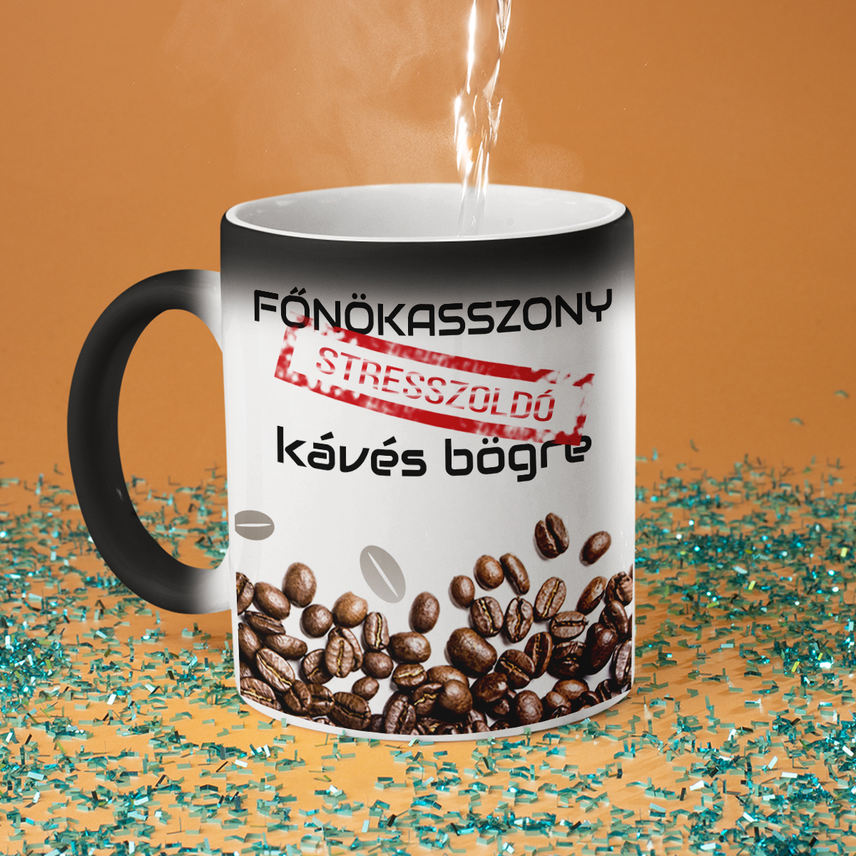 - Varázsbögre – nem véletlenül hívják varázsbögrének! Első ránézésre egy egyszerű fekete bögre, de amikor forró vizet öntesz bele, fehérre változik, és a rejtett nyomat megjelenik. Igazi meglepetés és egy kis csoda minden nap!