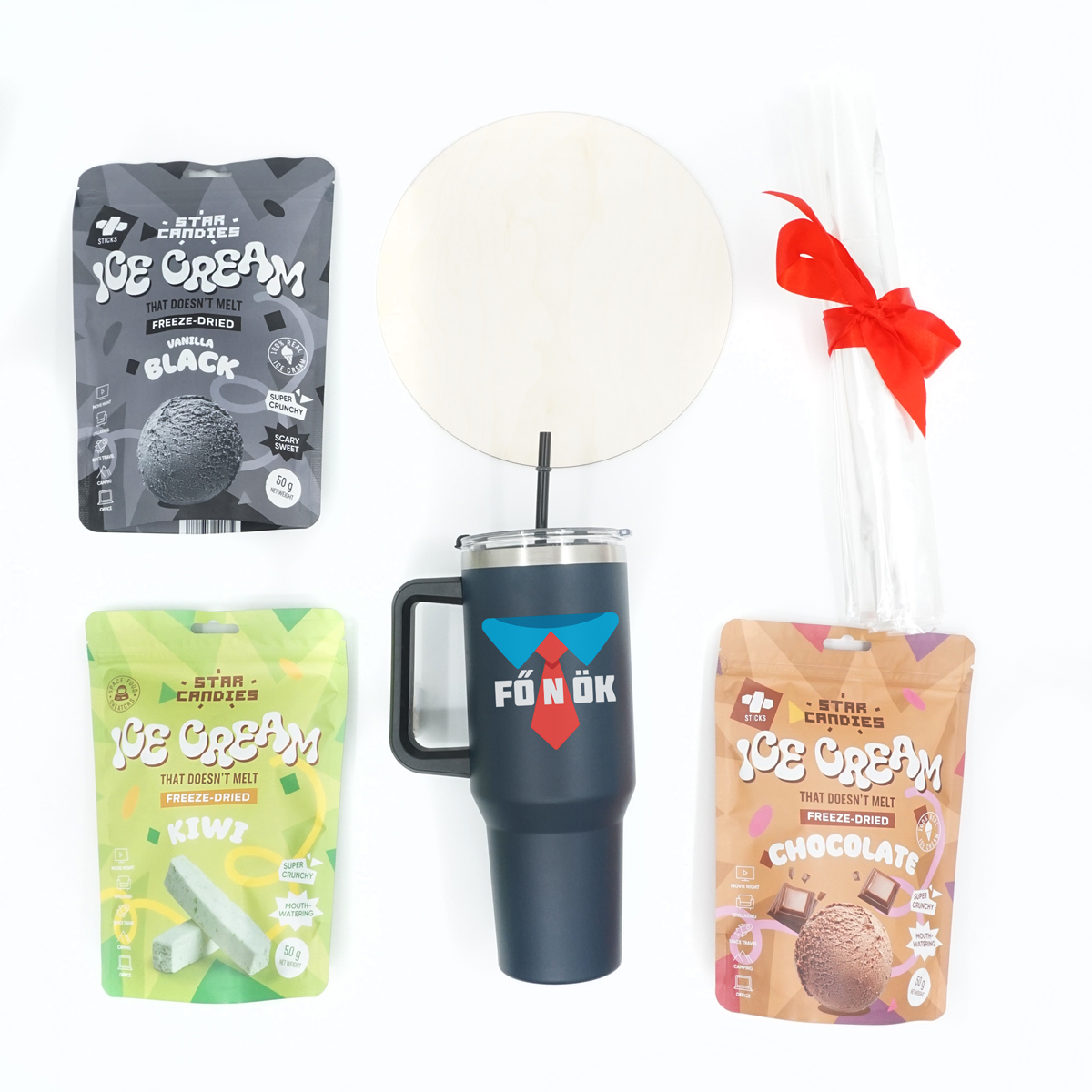 Az ajándékkészlet ajándékba csomagolható, a csomagolóanyagokat (szalag és ajándékcsomagolópapír) tartalmazza.