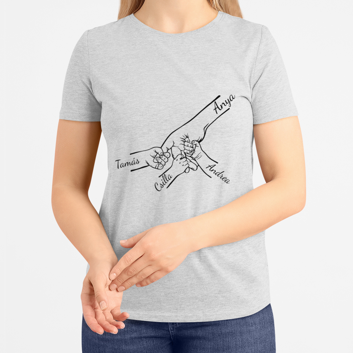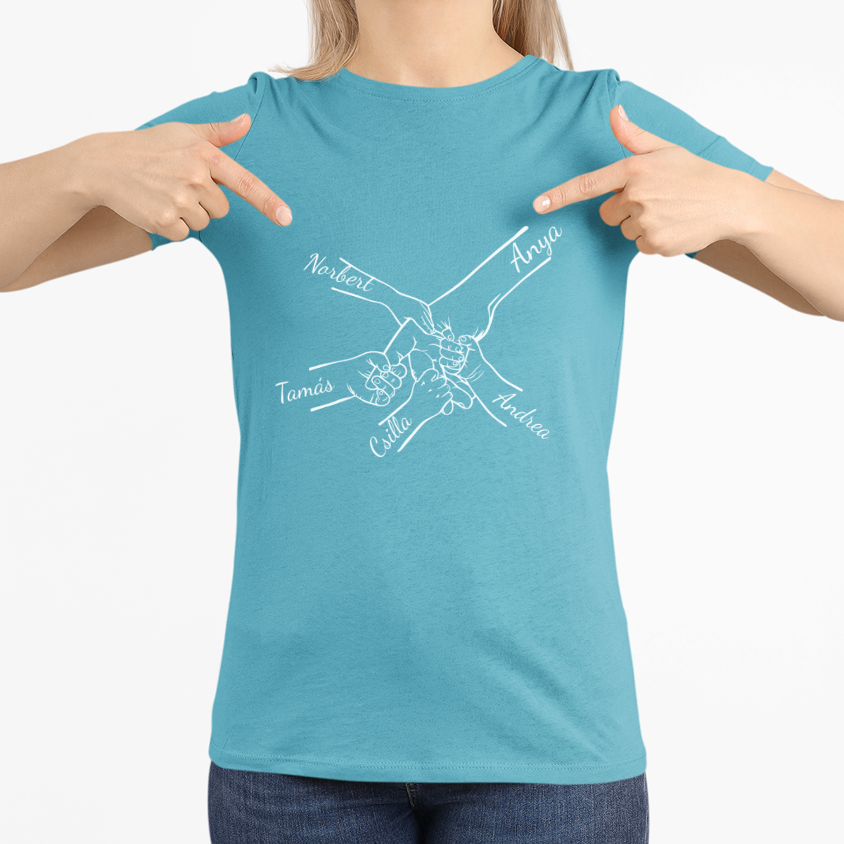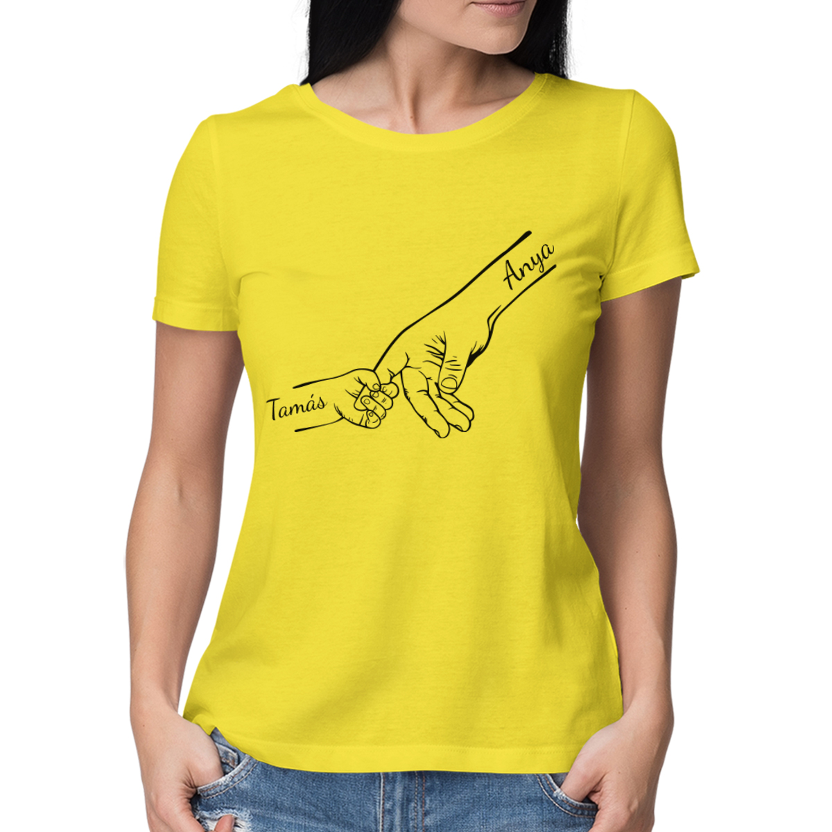 "Anya és gyermekei" feliratú női póló, kiválasztott gyermeknevekkel