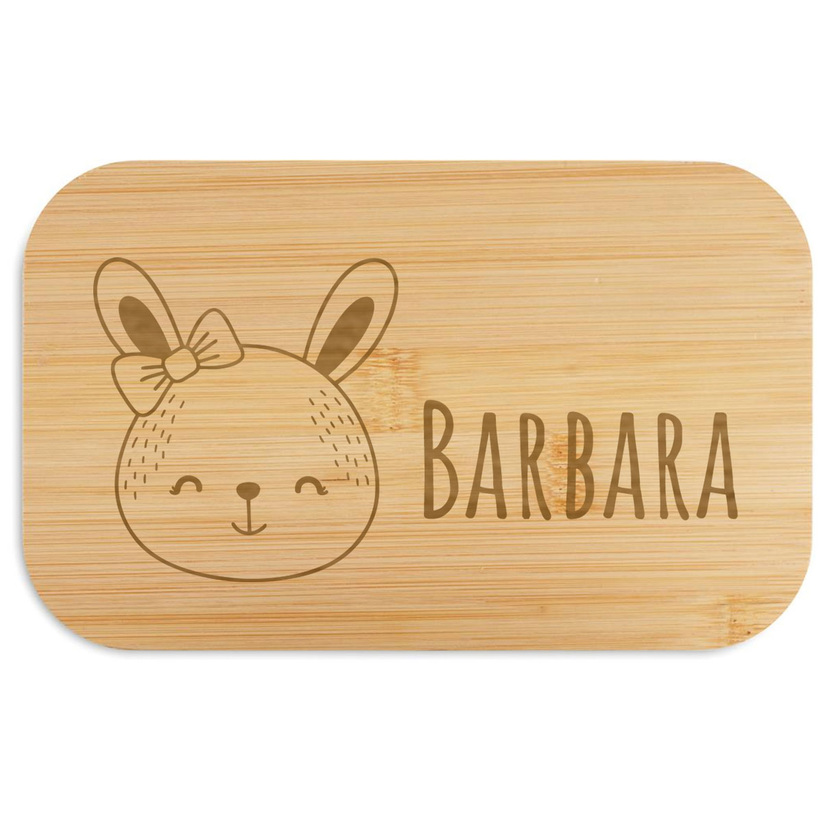 Nyuszis mintás uzsonnás doboz az általad választott névvel – praktikus választás gyermekek étkezéséhez óvodába, iskolába vagy kirándulásokra. A név segít könnyen azonosítani a dobozt, a kompakt méret pedig kényelmes tárolást biztosít.