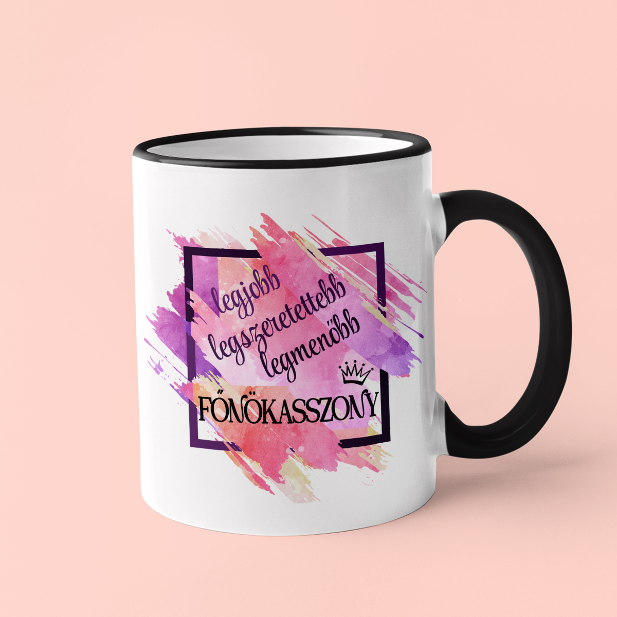 - Színes peremű bögre – ez a modell stílusos kialakításával tűnik ki: finoman színezett perem és nyél, amelyek játékosságot adnak a bögrének, és tökéletesen kiemelik az egyedi feliratot.