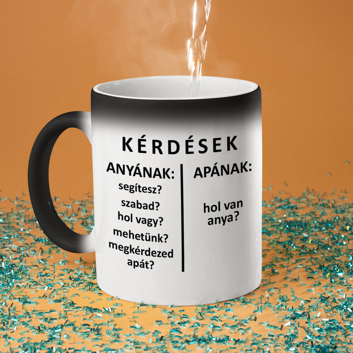 - Varázsbögre – nem véletlenül hívják varázsbögrének! Első ránézésre egy egyszerű fekete bögre, de amikor forró vizet öntesz bele, fehérre változik, és a rejtett nyomat megjelenik. Igazi meglepetés és egy kis csoda minden nap!