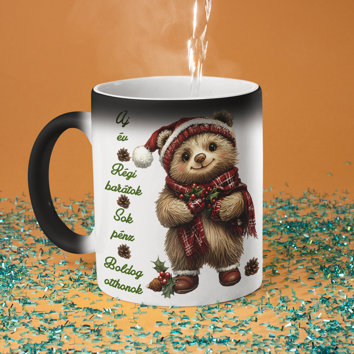 - Varázsbögre – nem véletlenül hívják varázsbögrének! Első ránézésre egy egyszerű fekete bögre, de amikor forró vizet öntesz bele, fehérre változik, és a rejtett nyomat megjelenik. Igazi meglepetés és egy kis csoda minden nap!