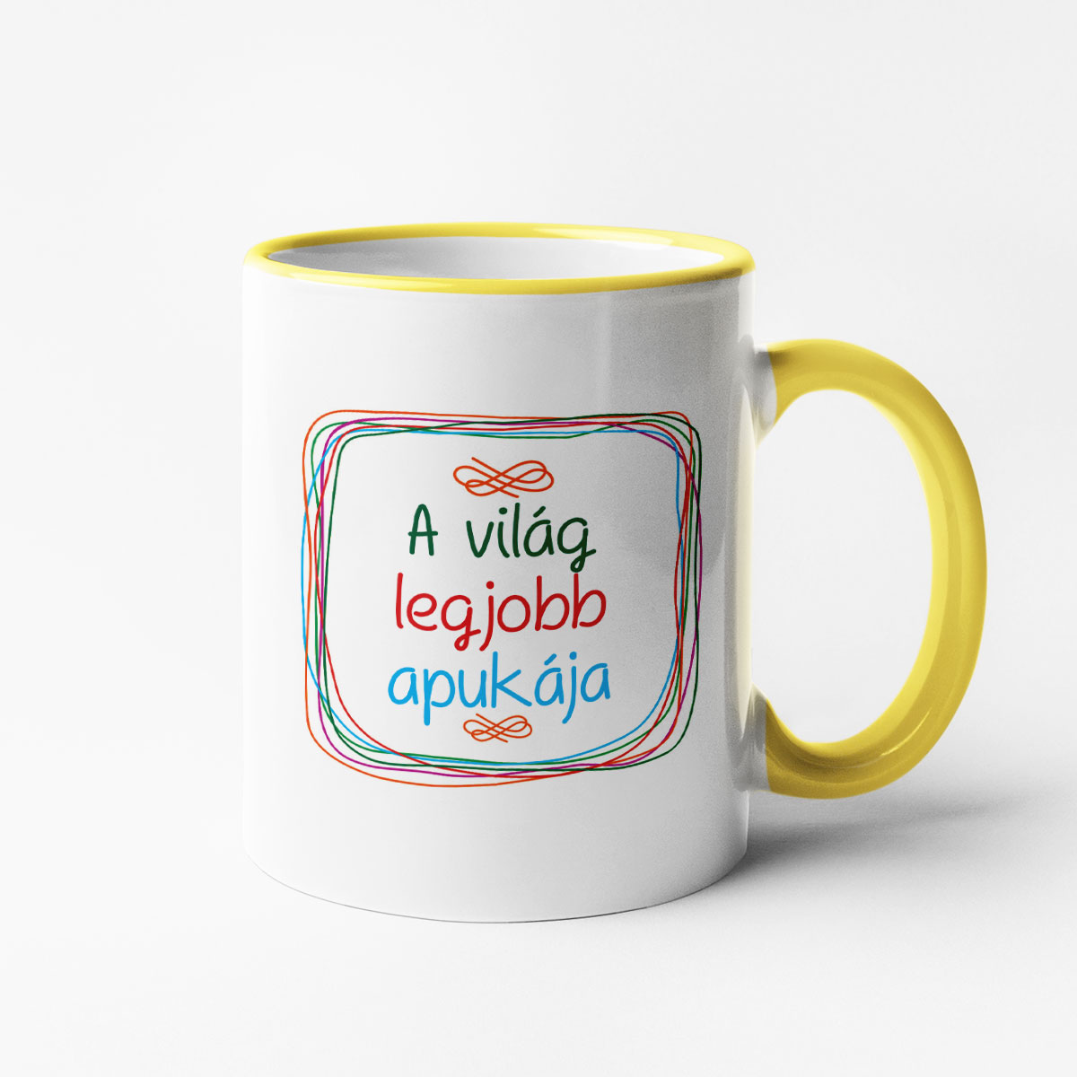 - Színes peremű bögre – ez a modell stílusos kialakításával tűnik ki: finoman színezett perem és nyél, amelyek játékosságot adnak a bögrének, és tökéletesen kiemelik az egyedi feliratot.