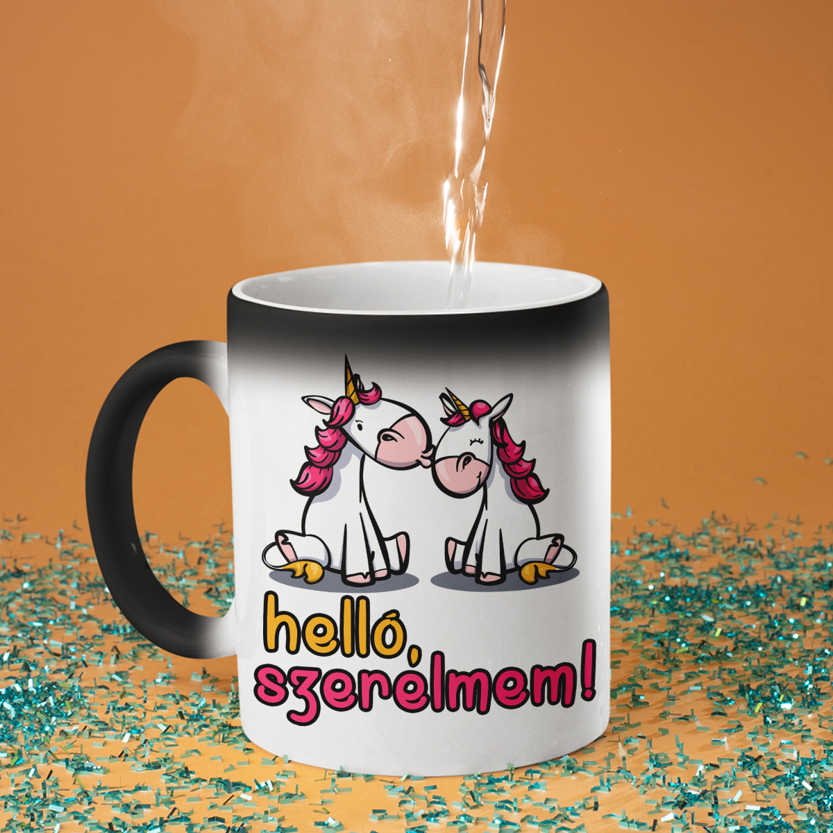 - Varázsbögre – nem véletlenül hívják varázsbögrének! Első ránézésre egy egyszerű fekete bögre, de amikor forró vizet öntesz bele, fehérre változik, és a rejtett nyomat megjelenik. Igazi meglepetés és egy kis csoda minden nap!