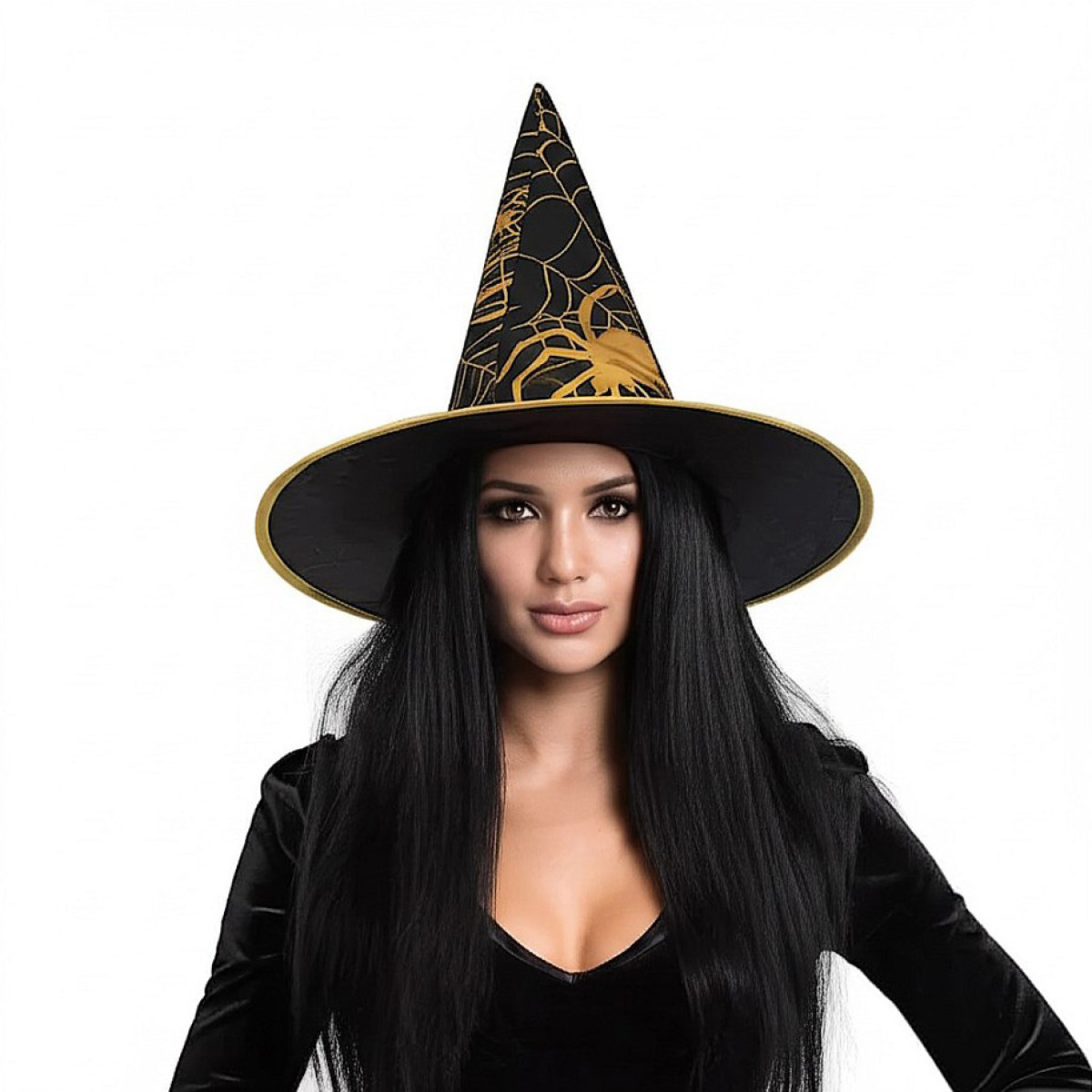 A boszorkánysapka a Halloween, farsang vagy tematikus ünnepségek elengedhetetlen kelléke. A fekete, hegyes kalapot aranyszínű pókháló és egy pók díszíti, ami egyedi és misztikus hangulatot kölcsönöz a megjelenésnek.