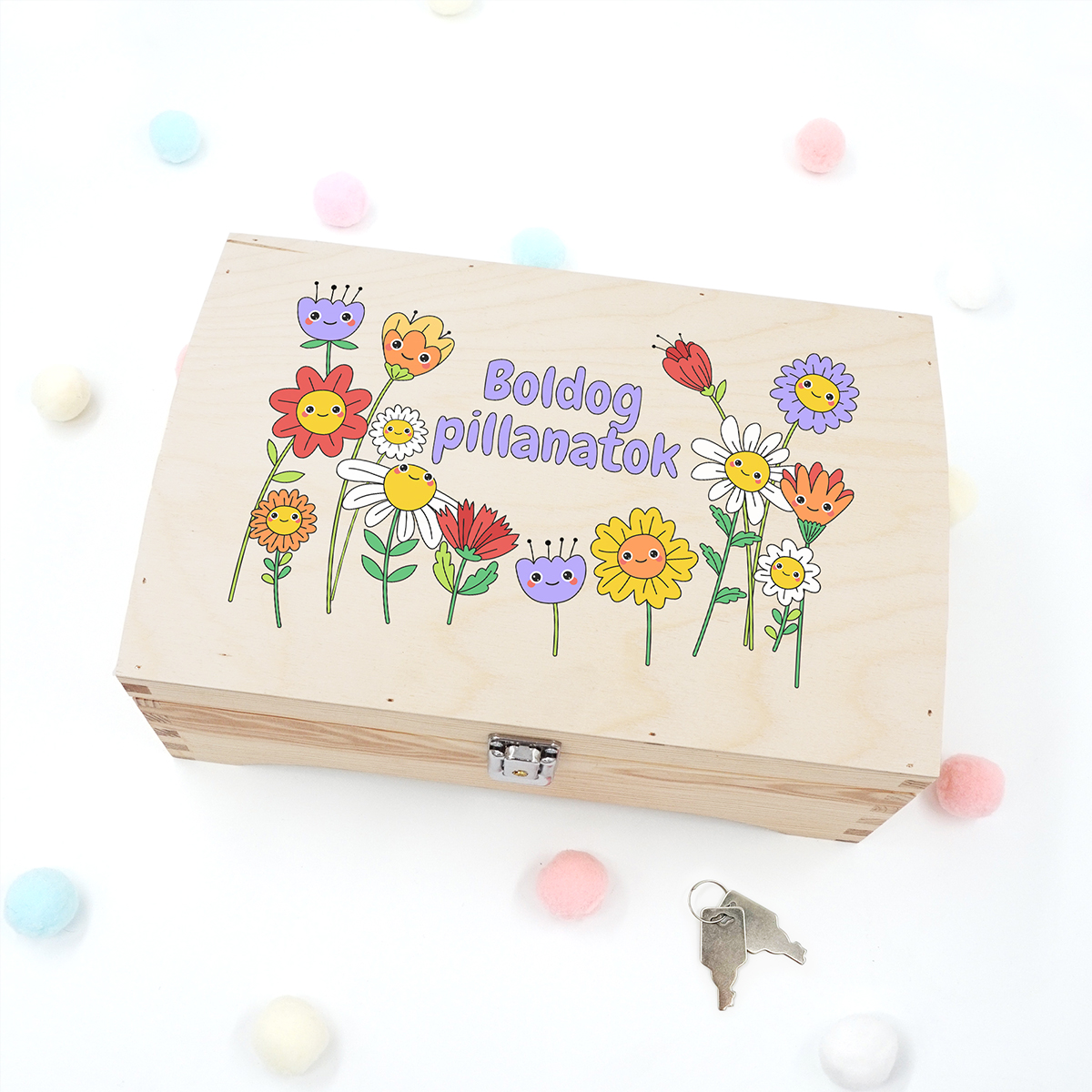A fából készült láda tökéletes hely a kis gyermekkori kincsek, titkok és értékes emlékek tárolására. Tegyél bele fényképeket, apró ajándékokat, játékokat vagy más aranyos csecsebecséket, hogy emlékeztessenek a fontos pillanatokra.
