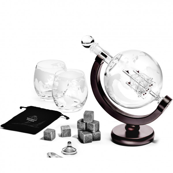 Ikonikus földgömb alakú dekantáló kő kockákkal és gravírozott poharakkal DELUXE verzióban. A szett kiegészítője csodálatos kő kockák italok hűtéséhez, amelyek filczsákban vannak elhelyezve, fém csipesz a kockák pohárba helyezéséhez, és egy praktikus kiöntőcső, amely megkönnyíti a földgömb utántöltését csöpögés nélkül.