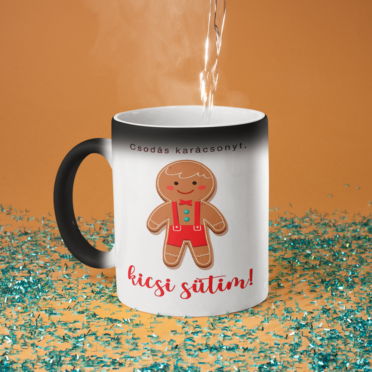 - Varázsbögre – nem véletlenül hívják varázsbögrének! Első ránézésre egy egyszerű fekete bögre, de amikor forró vizet öntesz bele, fehérre változik, és a rejtett nyomat megjelenik. Igazi meglepetés és egy kis csoda minden nap!