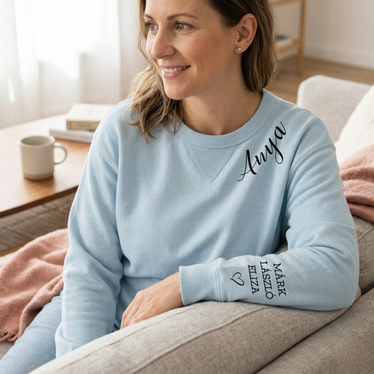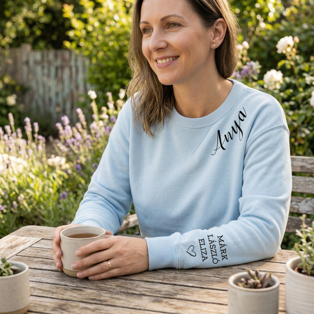UNISEX pasztellszínű "Sully" pulóver "Anya" a gyermekek nevével a kabátujjon