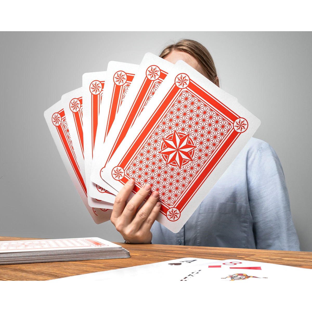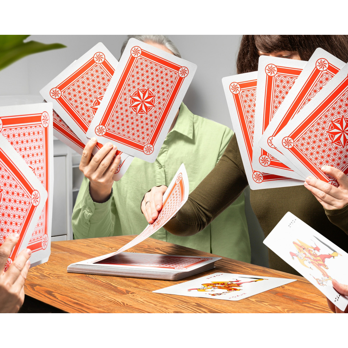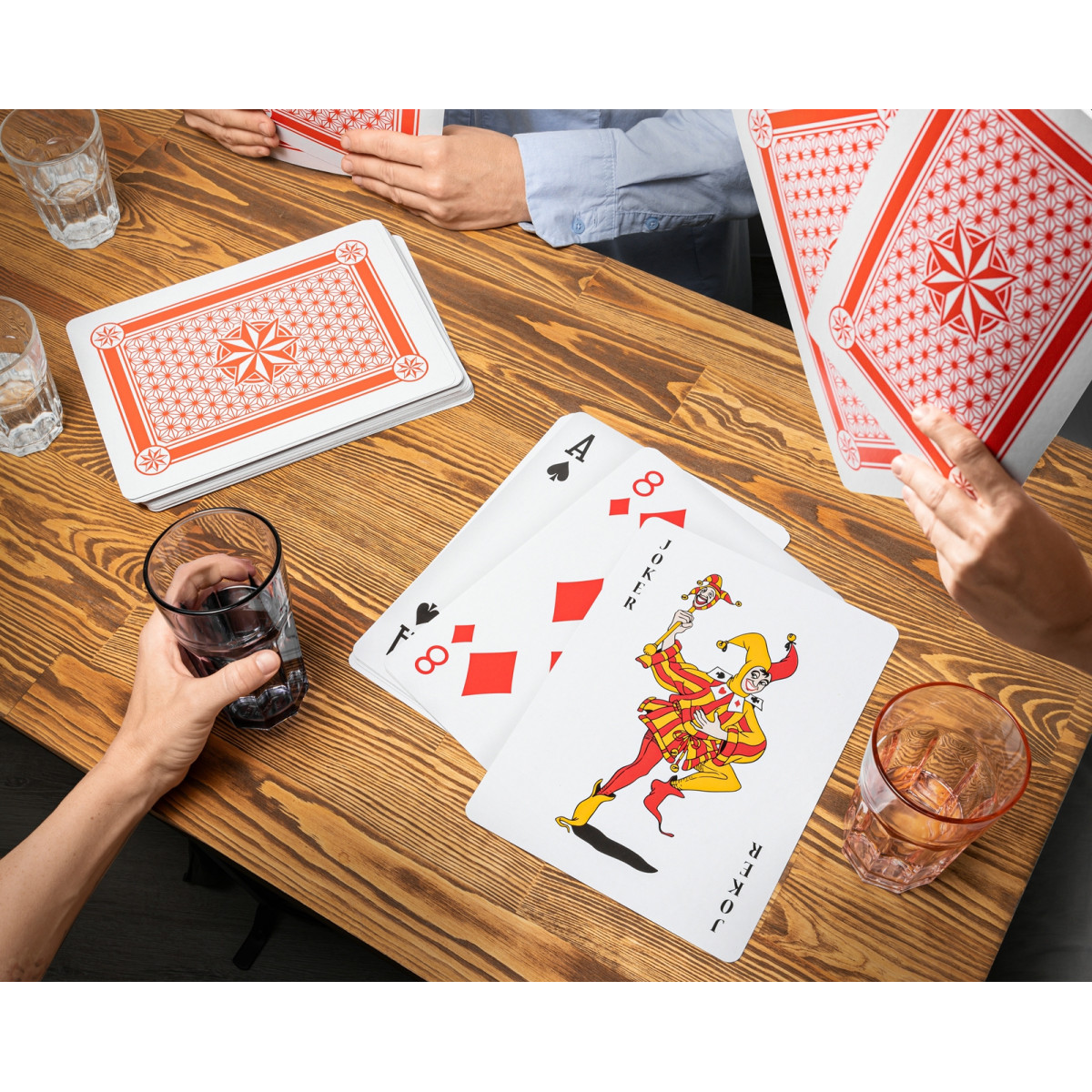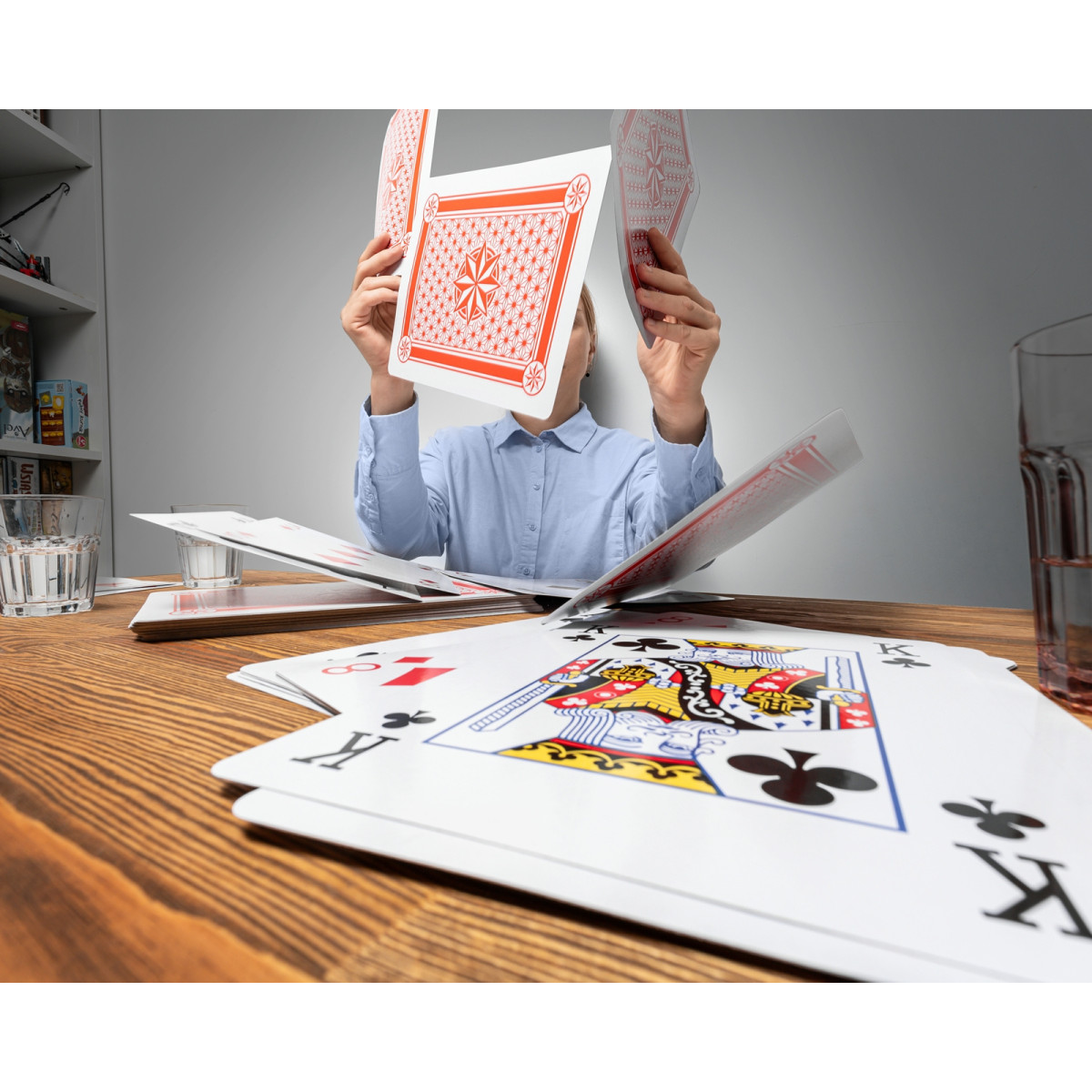 Miért korlátoznád magad a hagyományos kártyákra, amikor óriási kártyákkal is játszhatnál? Az XXL kártyák nemcsak extra szórakozást nyújtanak, hanem kényelmesebbé is teszik a játékot – nem kell hunyorogni vagy szemüveget keresni, mert minden távolról is jól látható. Ráadásul nem lehet csalni az asztalnál – egy XXL ász biztosan nem fér el a kabátujjadban! A kártyák speciális műanyag bevonattal vannak ellátva, ami merevebbé, kényelmesebbé és tartósabbá teszi őket.