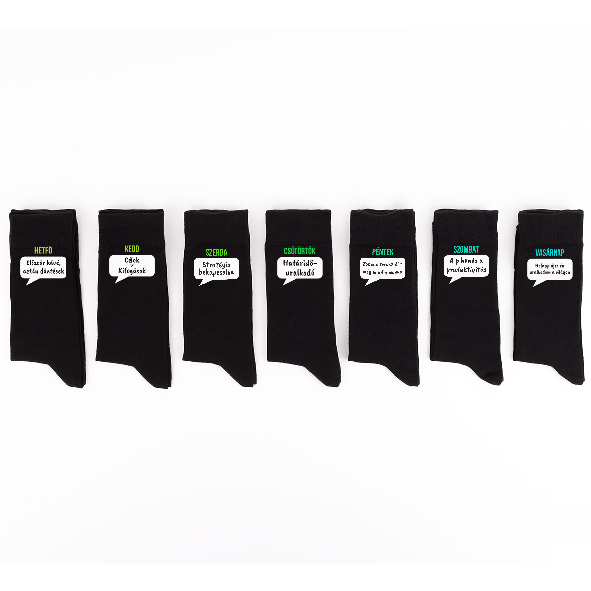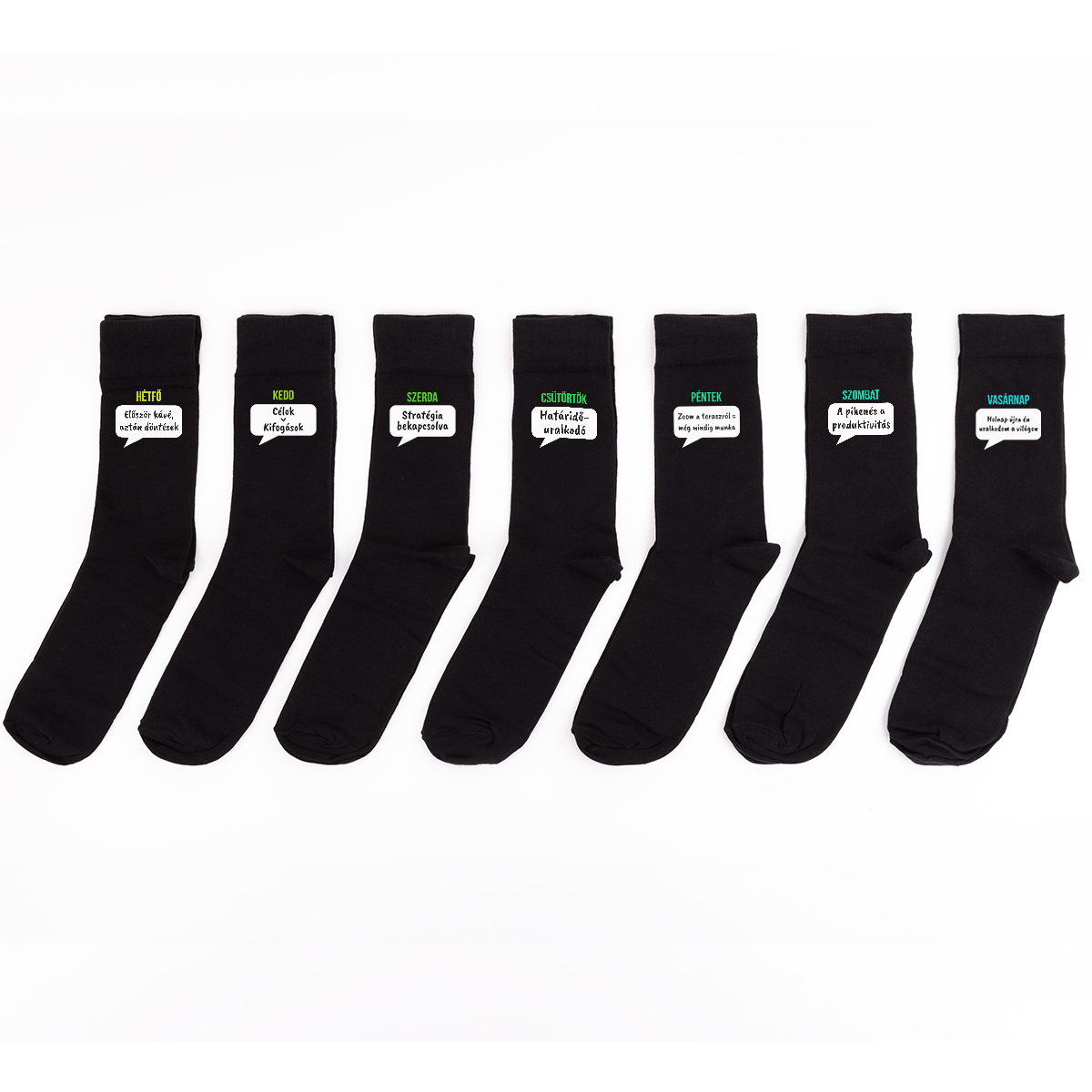 - 7 pár zokni, mindegyik zoknin egy-egy nyomtatással (7 különböző elrendezés x 2 db).